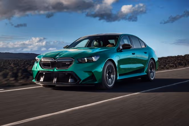 The new BMW M5 (₹1.99 Cr, ex-showroom India) is a plug-in hybrid sports sedan powered by a 4.4L twin-turbo V8 + electric motor producing 727 hp & 1,000 Nm. It does 0–100 km/h in 3.5 sec, offers up to 69 km electric range, and reaches 305 km/h (with M Driver’s Package). Key highlights include xDrive AWD, adaptive M suspension, rear-axle steering, curved digital display, carbon-fibre elements, and luxury interiors.